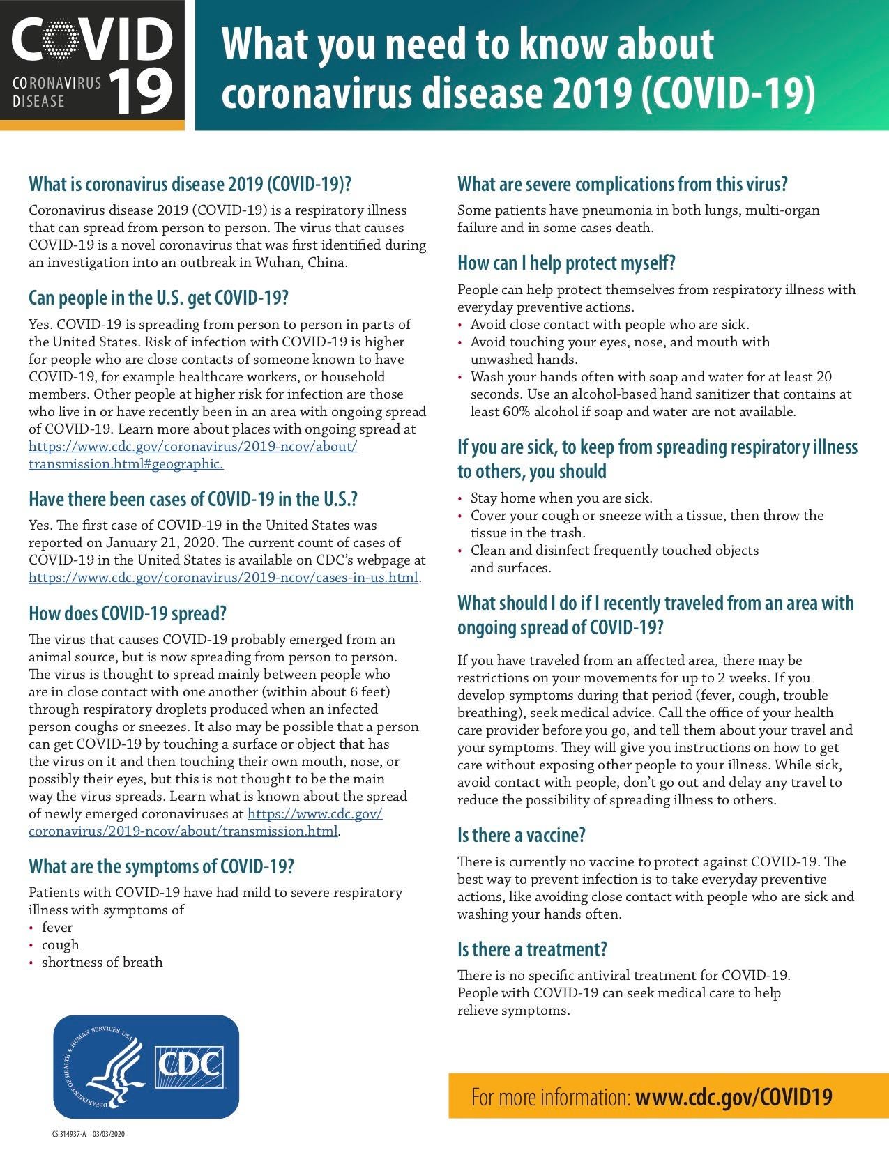 For the latest reputable information on the virus, please visit CDC.gov/COVID19. At this time, they are encouraging everyone to wash their hands and to be cognizant if you are in one of the higher risk groups. If you have concerns, please call or visit your local health professional.